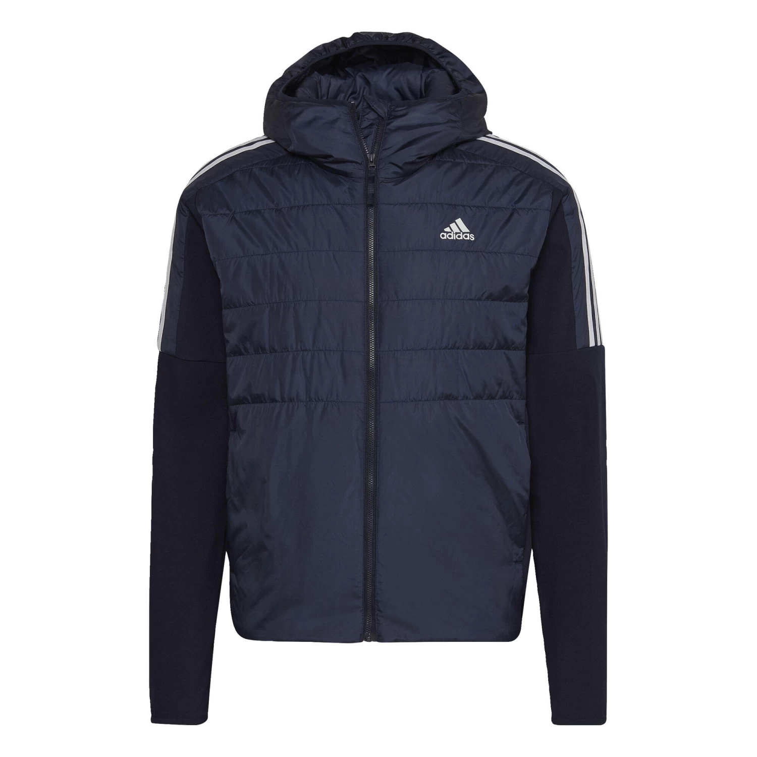 Sweatshirt casual meets parka warmth in this adidas hybrid jacket. Perfect for a short hike, a night out or a quick trip to the corner store, it’s a versatile addition to your cool-weather wardrobe. The combination of lightweight padding and synthetic insulation makes wearing it a cosy, comfortable experience. The 3-Stripes stand out strong for classic sportswear heritage.Made with a series of recycled materials, and at least 60% recycled content, this product represents just one of adidas’ solutions to help end plastic waste.