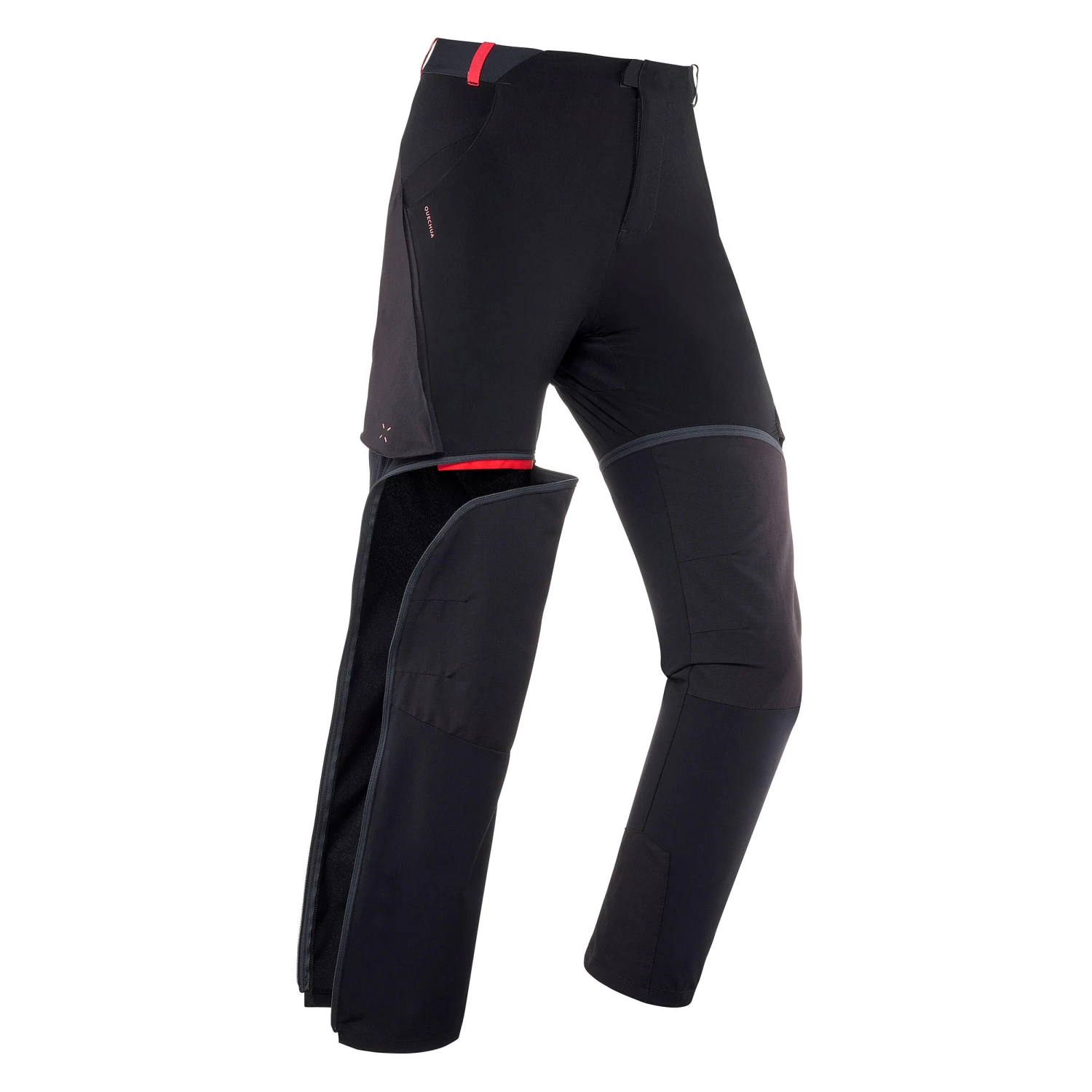 Trousers turn into shorts thanks to a side zip on the legs. The lower part of the trousers that remains attached can be tucked away in the side pockets with safety clips.