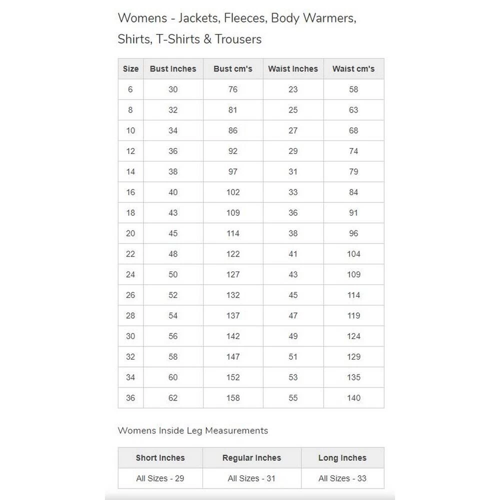 - Regatta Womens sizing (bust approx): 6 (30in/76cm), 8 (32in/81cm), 10 (34in/86cm), 12 (36in/92cm), 14 (38in/97cm), 16 (40in/102cm), 18 (43in/109cm), 20 (45in/114cm), 22 (48in/122cm), 24 (50in/127cm), 26 (52in/132cm), 28 (54in/137cm), 30 (56in/142cm), 32 (58in/147cm), 34 (60in/152cm), 36 (62in/158cm).