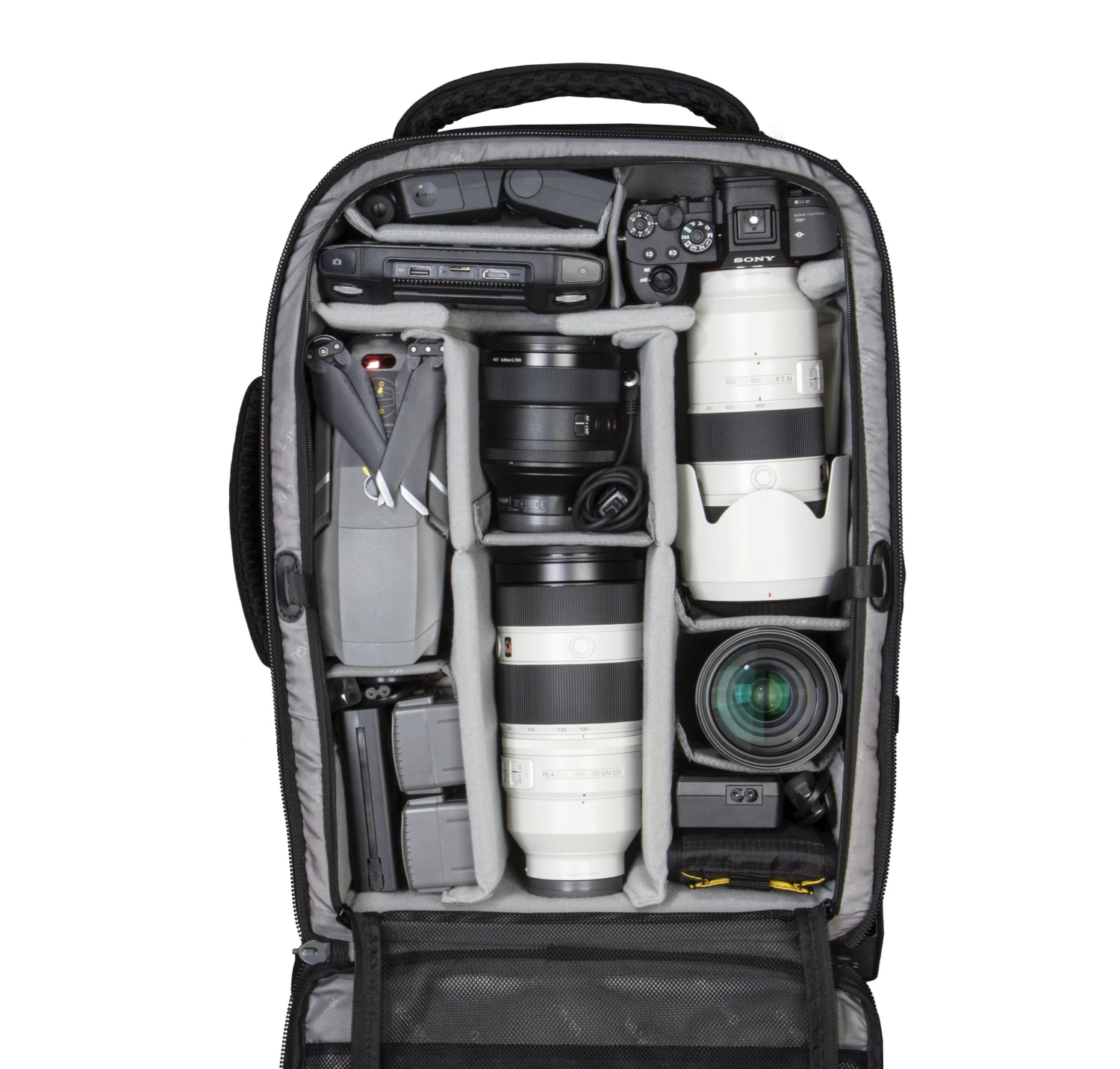 Having just 2-wheels allows a little extra interior space and allows you to carry larger lenses than most 4-wheel roller cases in it’s customisable 330 x 170 x 470mm interior. The space will allow you to 2-3 pro DSLR/mirrorless cameras with grip(s), 8-10 lenses (up to 400mm f/2.8), a flash unit, a 17″ laptop with a 9.7″ tablet and multiple accessories such as memory cards, cables, batteries and a charger. Alternatively the interior can be removed, allowing you to use it as everyday luggage.